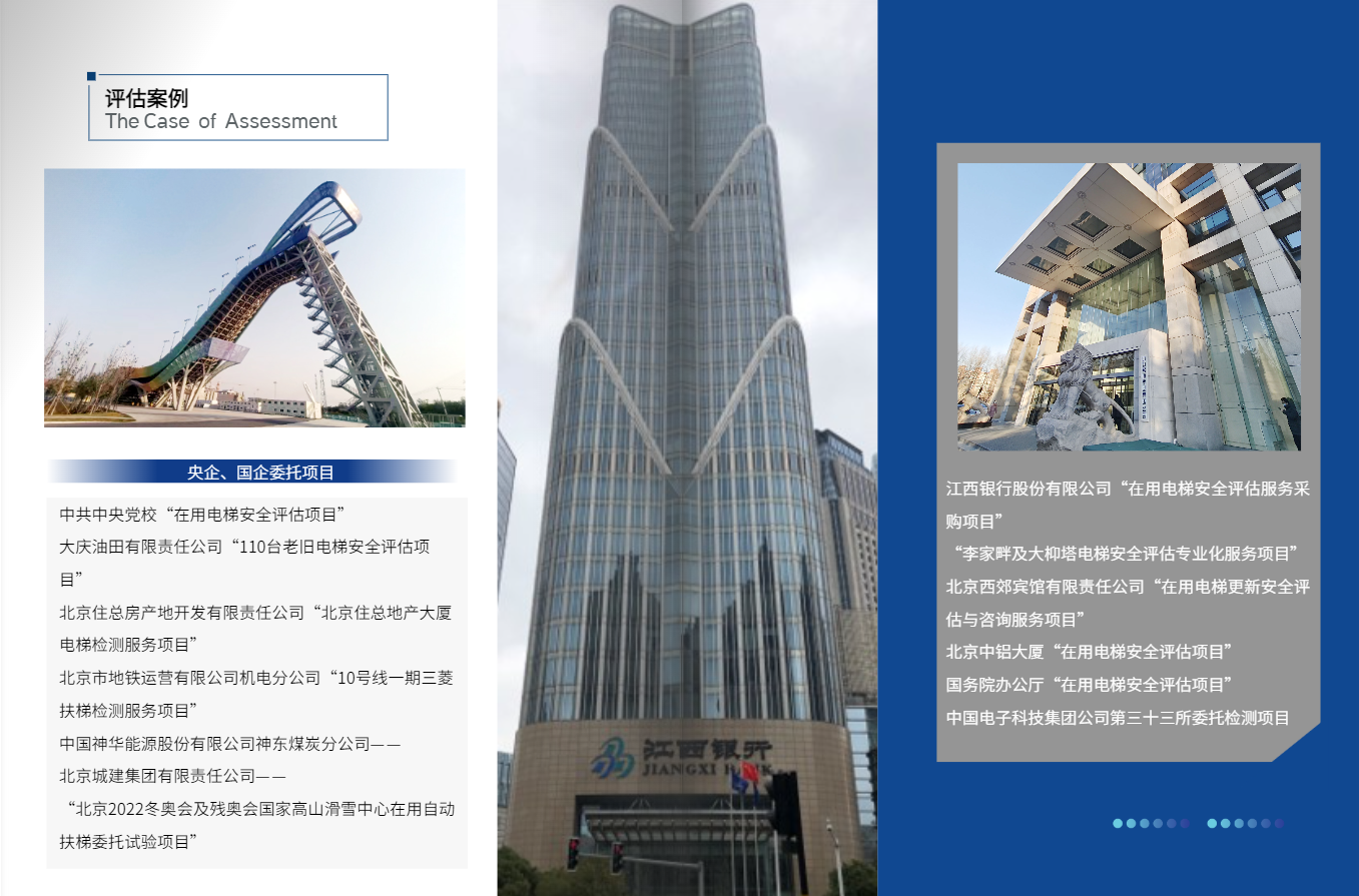 NETEC專門設(shè)置了由電梯行業(yè)資深技術(shù)專家、經(jīng)驗(yàn)豐富的電梯檢驗(yàn)人員組成的電梯檢測評估部。目前NETEC已在北京、天津、黑龍江、河北、廣東、山東、陜西等地廣泛開展在用電梯安全評估業(yè)務(wù),為在用電梯的安全運(yùn)行提供了科學(xué)、權(quán)威、可行的評估指導(dǎo)意見,積累了豐富的評估經(jīng)驗(yàn)。