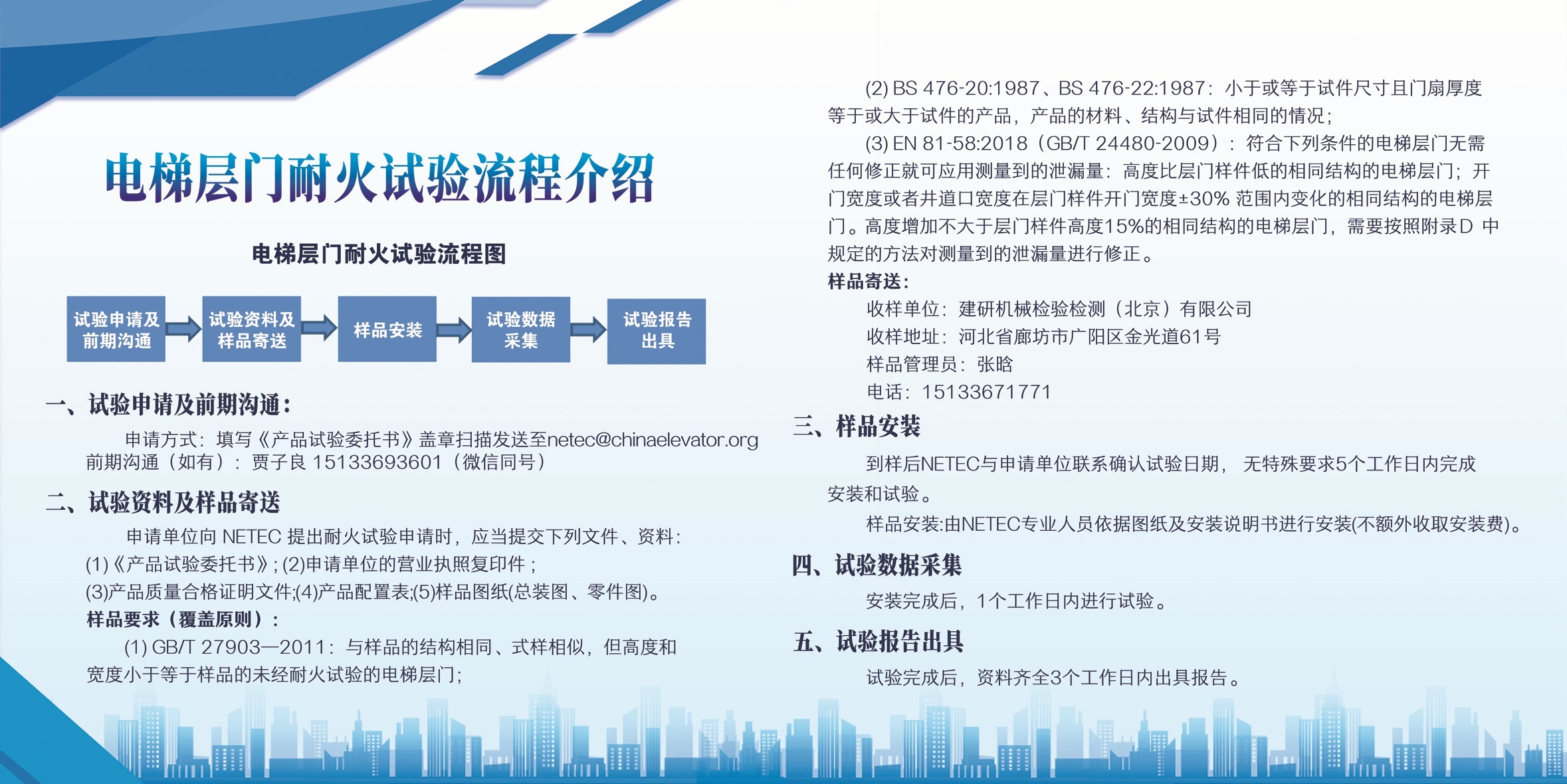 試驗依據(jù):GB/T 24480—2009《電梯層門耐火試驗 泄漏量、隔熱輻射測定法》、 GB/T 27903—2011《電梯層門耐火試驗 完整性、隔熱性和熱通量測定法》、 BS476(英標(biāo)建筑材料及構(gòu)件防火耐火測試)。