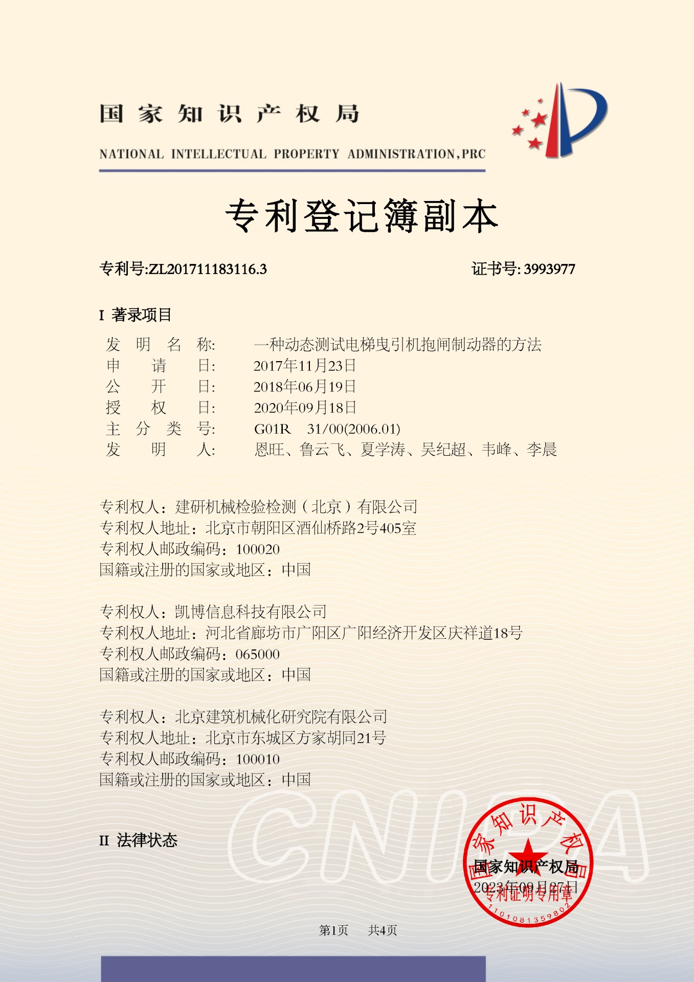 實(shí)用新型專利——試驗(yàn)曳引機(jī)制動(dòng)器式電梯轎廂上...
