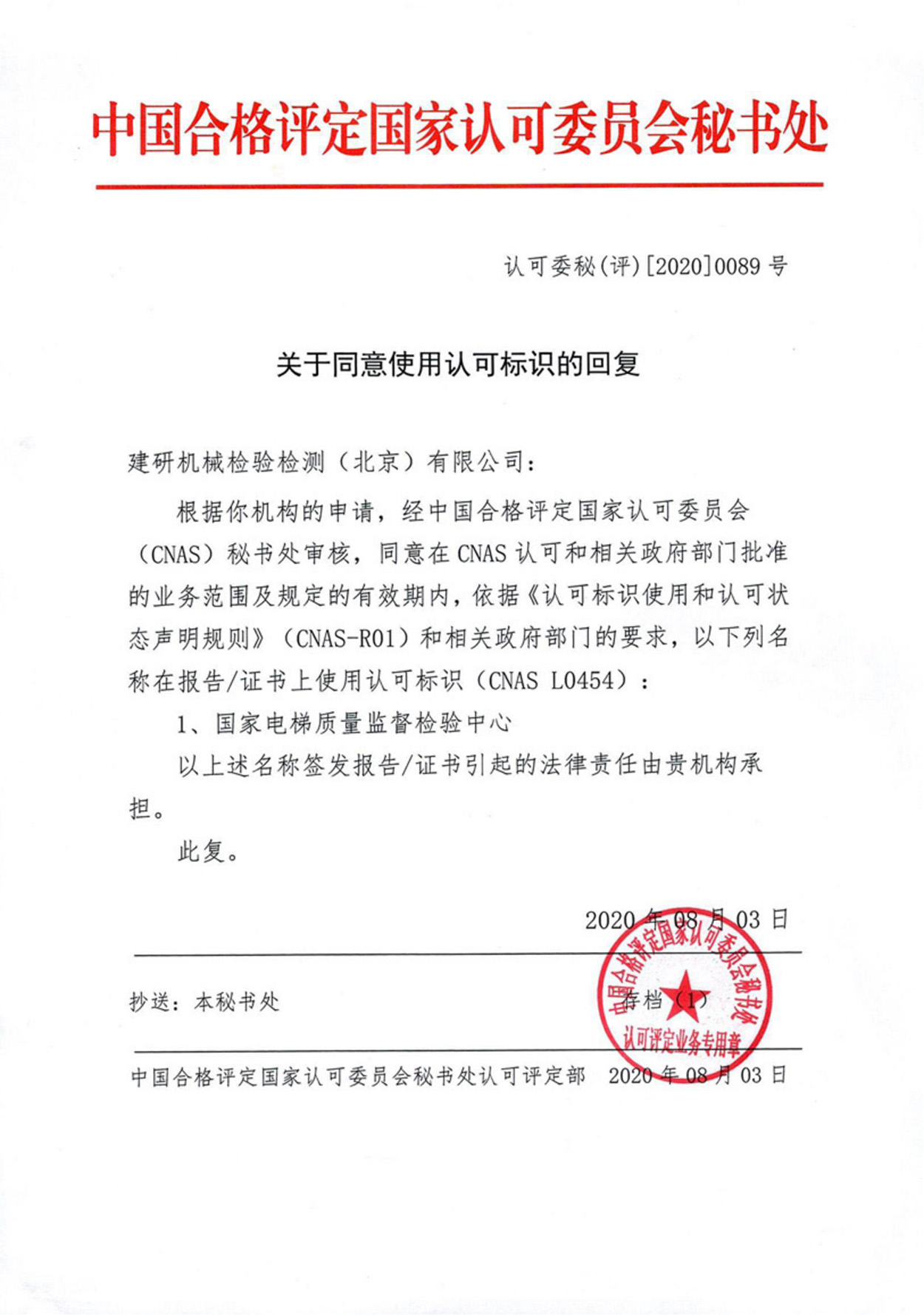 關(guān)于同意國(guó)家電梯質(zhì)檢中心使用CNAS標(biāo)識(shí)的回復(fù)